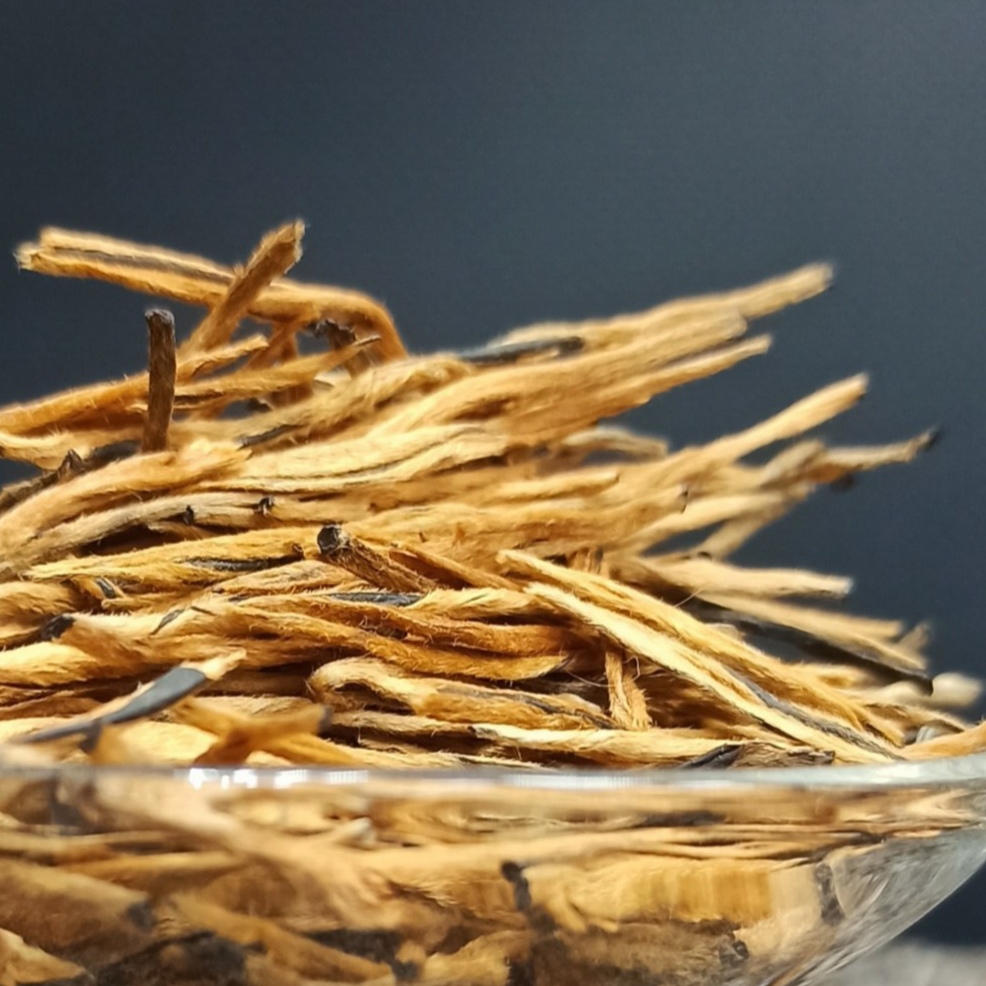У элитных сортов можно заметить золотистые или серебристые ворсинки (типсы) — это почки, которые придают чаю особую нежность и сладость.